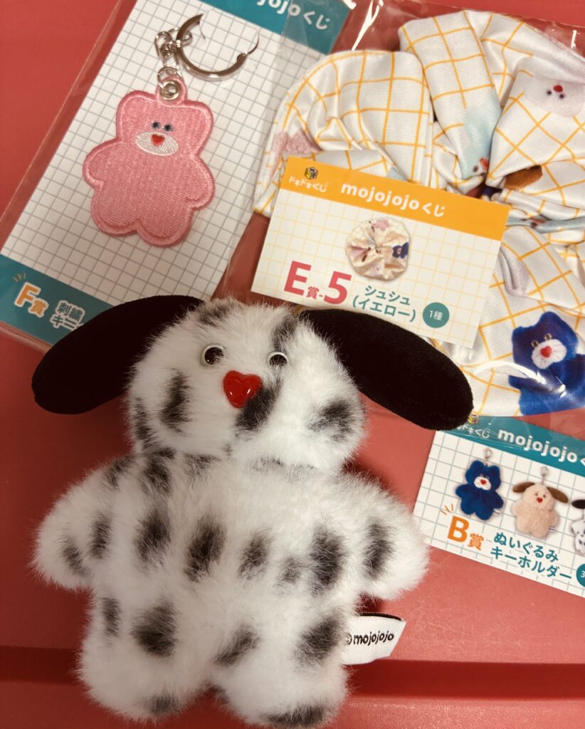 最初にB賞のぬいぐるみキーホルダー、2枚目は娘が引いてE賞シュシュ、3回目はF賞刺繍キーホルダー。