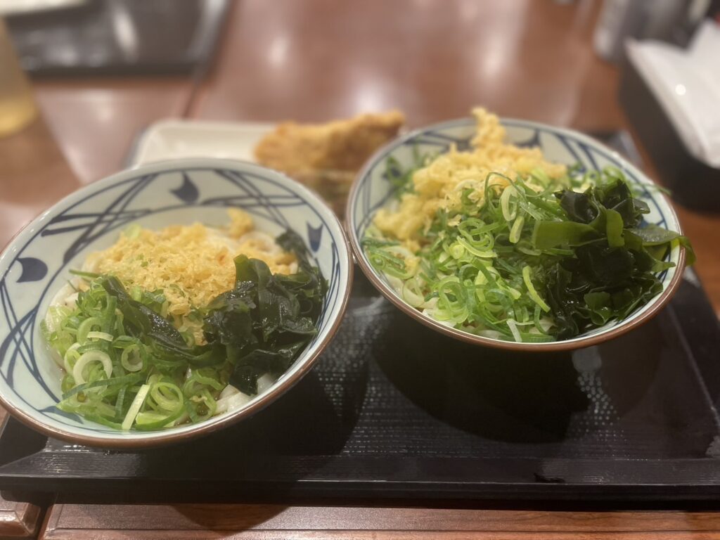 娘と2人、ネギ、わかめ、天かすをたっぷりかけて美味しくいただきました。